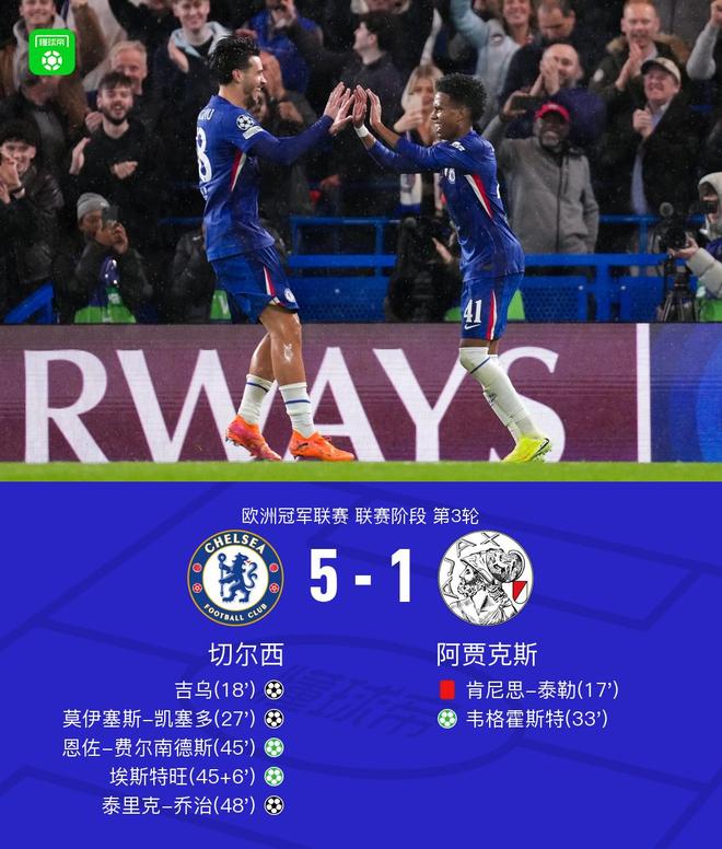 北京时间10月23日,欧冠阶段第三轮,切尔西对阵阿贾克斯。上半场,泰勒因飞铲被罚下场,阿贾克斯以十人回应。福法纳助攻,吉乌进球。凯塞多远射,皮球应声入网。阿达拉比奥尤送分,韦格霍斯特罚球。随后,韦格霍斯特击倒恩佐得分,恩佐罚球。半场结束前,蓝军再次获得点球,埃斯特万主罚命中。下半场,乔治进球。全场比赛结束,切尔西5-1击败十人阿贾克斯。主赛事第18分钟,福法纳助攻,吉奥破门,切尔西1-0。第17分钟,切尔西进球前,肯尼思·泰勒因飞铲被红牌罚下。第26分钟,凯塞多远射,皮球击中阿贾克斯。后卫弹射入网,切尔西2-0。第33分钟,阿达拉比奥尤走人送出点球。韦格霍斯特主罚点球恶心。阿贾克斯1-2。第45分钟,韦格霍斯特送分。恩佐主罚命中。切尔西 3-1。第45+5分钟,切尔西再获点球,埃斯特班主罚命中,切尔西4-1。第48分钟,被挡出。乔治射门偏出入网,切尔西5-1。双方球员在激动人心的时刻进入了比赛。比赛立即开始。第13分钟,切尔西传球精准,吉奥的射门被门将挡出。第18分钟,福法纳助攻,吉奥破门,切尔西1-0。第17分钟,切尔西进球前,肯尼思·泰勒在第23分钟飞铲被红牌罚下。由于球员较少,阿贾克斯很早就换下了格洛赫。第26分钟,凯塞多远射。皮球击中阿贾克斯后卫后折射入网。切尔西2-0。第33分钟,阿达拉比奥尤带球将点球扑出。韦格霍斯特主罚点球。新闻发布会,阿贾克斯1-2。第45分钟,韦格霍斯特送出博伊第二节,恩佐主罚点球,切尔西3-1。第45+5分钟,切尔西再获点球,埃斯特万主罚点球,切尔西4-1,第48分钟,点球偏出。乔治射门偏出入网,切尔西5-1。第56分钟,埃斯特班敲击对手被黄牌警告。第66分钟,切尔西换人,沃尔什替补上场。第70分钟,乔治传球,埃斯特班射门偏出。第80分钟,乔治闪身斜射破门被后卫挡出。第83分钟,乔治传球,埃斯特班头顶射门稍稍偏出。第90+4分钟,沃尔什将球射向球门,门将帕斯韦尔将球没收。球队阵容 技术统计