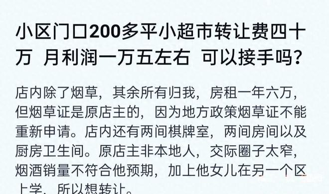 我发现了一个新手网友,大概没有任何经商经验。当他看到小区门口的超市要搬迁时,差点就掉进了原店老板的圈套!你认为如果有人真的赚了钱,他们会把钱送给陌生人吗?即使再忙,还有亲人、朋友!还好评论区有商界大佬出手,不然……头条的朋友们,我们来看看这个案例吧!下面三张图就是网友差点拍到的超市:什么叫专业?这才叫专业!谢谢老板!只要有生意还不错的店铺,一间就送给亲戚朋友,一间就送给同事。即使像您这样的初学者也知道,通常会有很大的陷阱在等着您!无论是在网上还是在现实生活中,请注意一件事:真正赚钱的行业谁没有亲戚和朋友?而不是优先考虑教亲戚朋友挣钱,你给陌生人吗?如今,对于很多店铺来说,利润不在于运营,而在于转让费:租一个店铺,装扮一下,做好销售,然后找个替罪羊高价搬走。我的朋友,人们首先想要赚的是转会费。至于正常的营业收入,还是等到猴年马年吧。当然,你也可以转让,但即使转让到原价,你还是会亏钱,因为你花的时间、装修、采购、生产、损失,没有20万元是不可能的!还有一个不好的举动告诉拉哈特避免陷入陷阱。例如,我的朋友接手了一家餐馆,发现生意不好,想搬迁。然后有人要拿,说我要查人流。结果朋友邀请了很多朋友来他的餐厅专吃两周,直到餐厅恢复营业。乌兰特感动了!这个技巧是为了欺骗初学者而设计的!朋友,你有商店吗?大家一起来讨论、分享我们的经验吧!