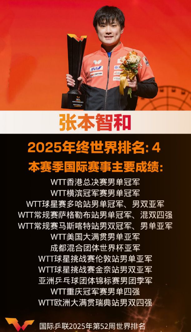 北京时间12月25日,WTT正式公布了日本乒乓球顶尖选手张本智和2025赛季的战绩。他在一个赛季中获得了4次男单冠军。 WTT1000+赛事设有两个男单冠军。最重要的是WTT香港总决赛。他是日本乒乓球历史上第一位在决赛中获得单打冠军的选手。张本智和今年的最终排名是第四。张本世和在2025年年终总决赛中凭借一些运气获得了冠军。半决赛前王楚钦因伤选择退赛。最终,张本士和在决赛中4-2莫加德夺得冠军。决赛之旅:4-2西蒙·高茨、4-3菲利克斯·勒布伦、4-3林诗栋、4-2莫尔加德。张本智和也结束了对小勒布朗的8连败。继12月15日打完香港总决赛后,张本智和12月16日在日本仅休息了四天后,就恢复了在T赛的比赛。-代表冈山参加联赛。最终冈山队以3-1击败琉球队。 Tomokazu Hari 参加了一场比赛。他的队友是韩国著名球员安宰贤。最终,张智和以3-1击败安宰贤。张本智胜3-1安宰贤本场比赛四局比分:11-8、11-10、10-11、11-7。 (这和WTT有点不同,就是谁先拿到11分,谁就获胜,而不是领先2分。) 本场比赛,张本智和打得相当轻松,安宰贤的硬实力和他确实有差距。冈山虽然拥有张本聪和日本顶尖乒乓球运动员,但冈山仅以18胜9负的战绩排在T联赛第四位。张本智和有很多WTT赛事和日本队的全国赛事要参加,所以他根本无法参加T联赛。这个赛季还没有结束。张本智和为冈山出战14场比赛,战绩为11胜3负,但队友们显得十分紧张。托梅ama战绩5负0胜,郝帅战绩8胜9负等,但没有人单打战绩胜率超过50%。